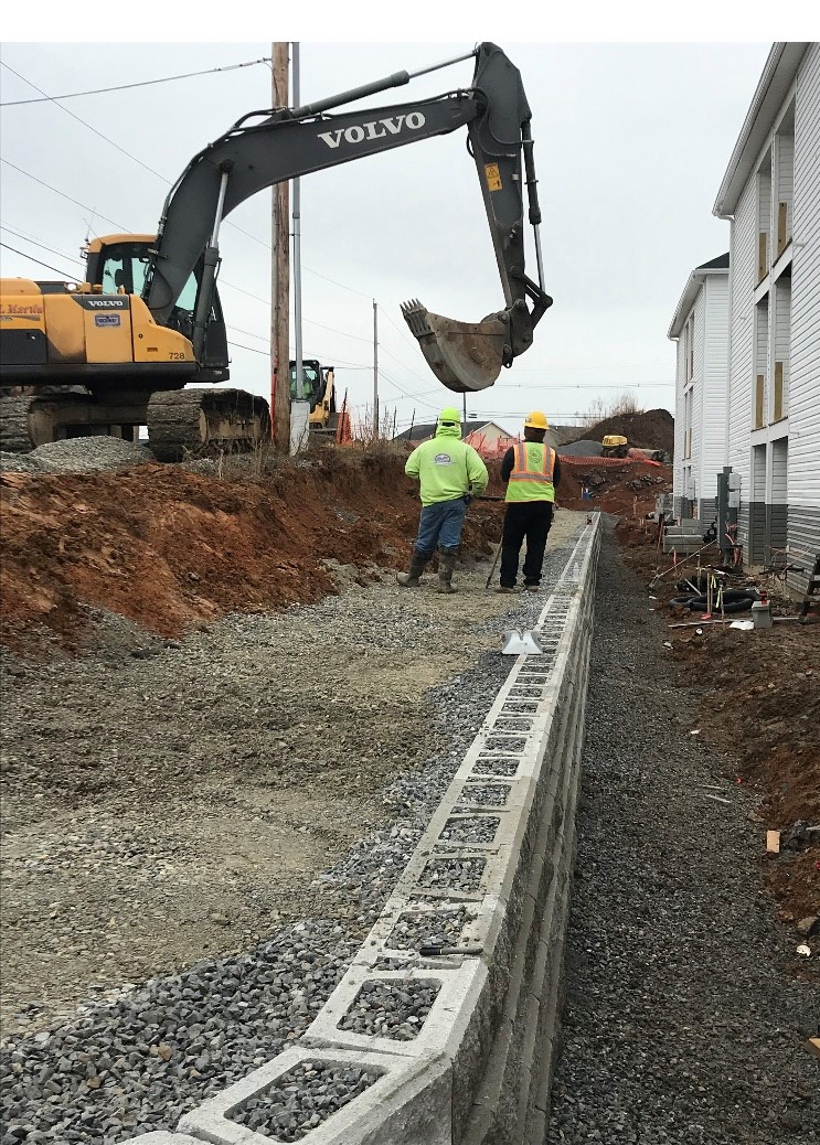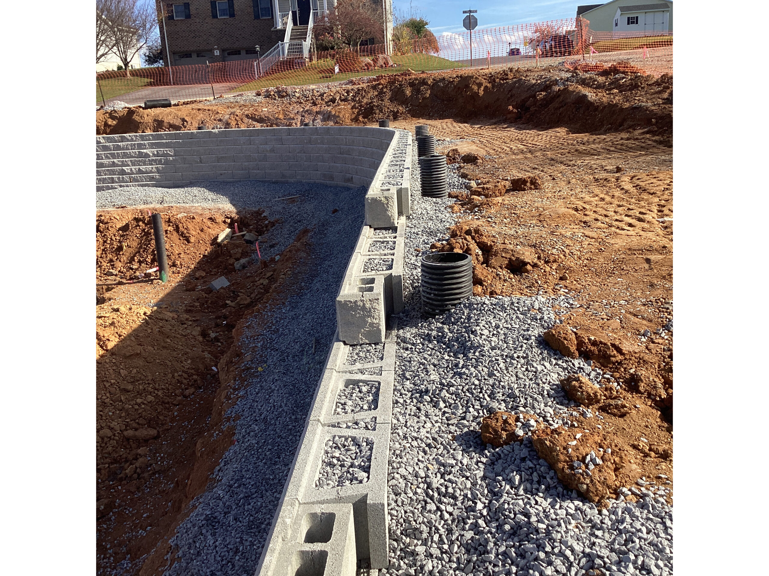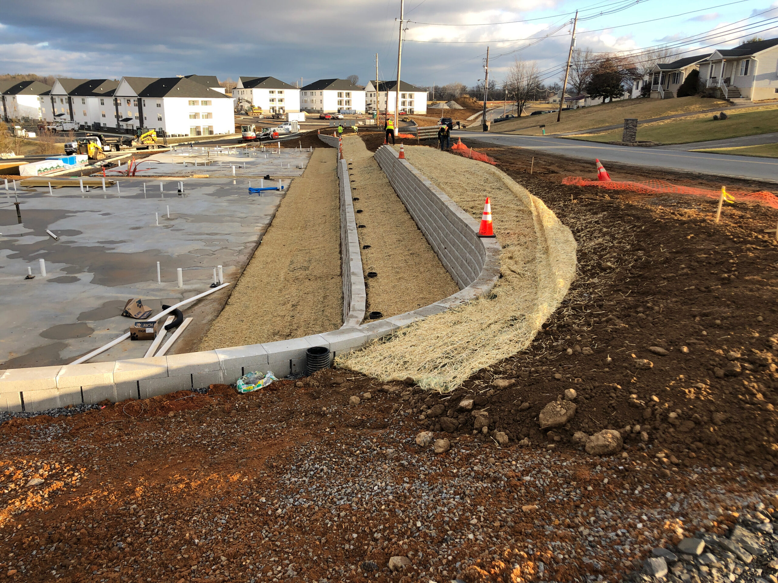 DHM crews handled everything from start to finish on these retaining walls at our Creekside project in Chambersburg. Starting with preparing the subgrade with compacted stone and then placing the retaining walls at several locations. Backfilling the walls as they were built and then ultimately preparing topsoil to be placed and graded. Seeding was completed and erosion control matting installed to decrease the chances of washouts. There was a total of 7250 square foot of retaining wall installed