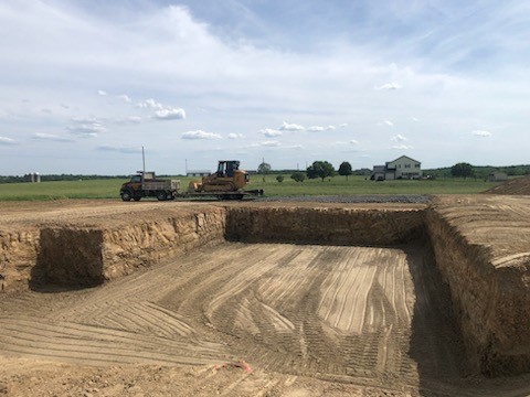 DHM crews excavated the basement for these homes. Often we will also place stone under the basement slab, install water, sewer, gas and electric from the roadway to the house. Once the house is framed up we will backfill the basement and garage area. Topsoil is placed for the proposed yard area and seed and straw is emplaced as the very last thing on the project