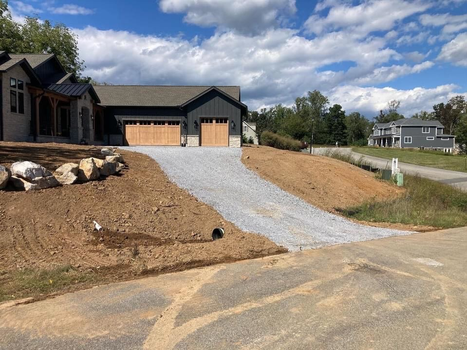 In this project we cleared the trees from the property and hauled them away. We excavated for the driveway and foundation, dug frost footers, backfilled the foundation, and final graded the lot. There was rock that needed removed by breaking with a hydraulic hammer to get the foundation in and the driveway graded.