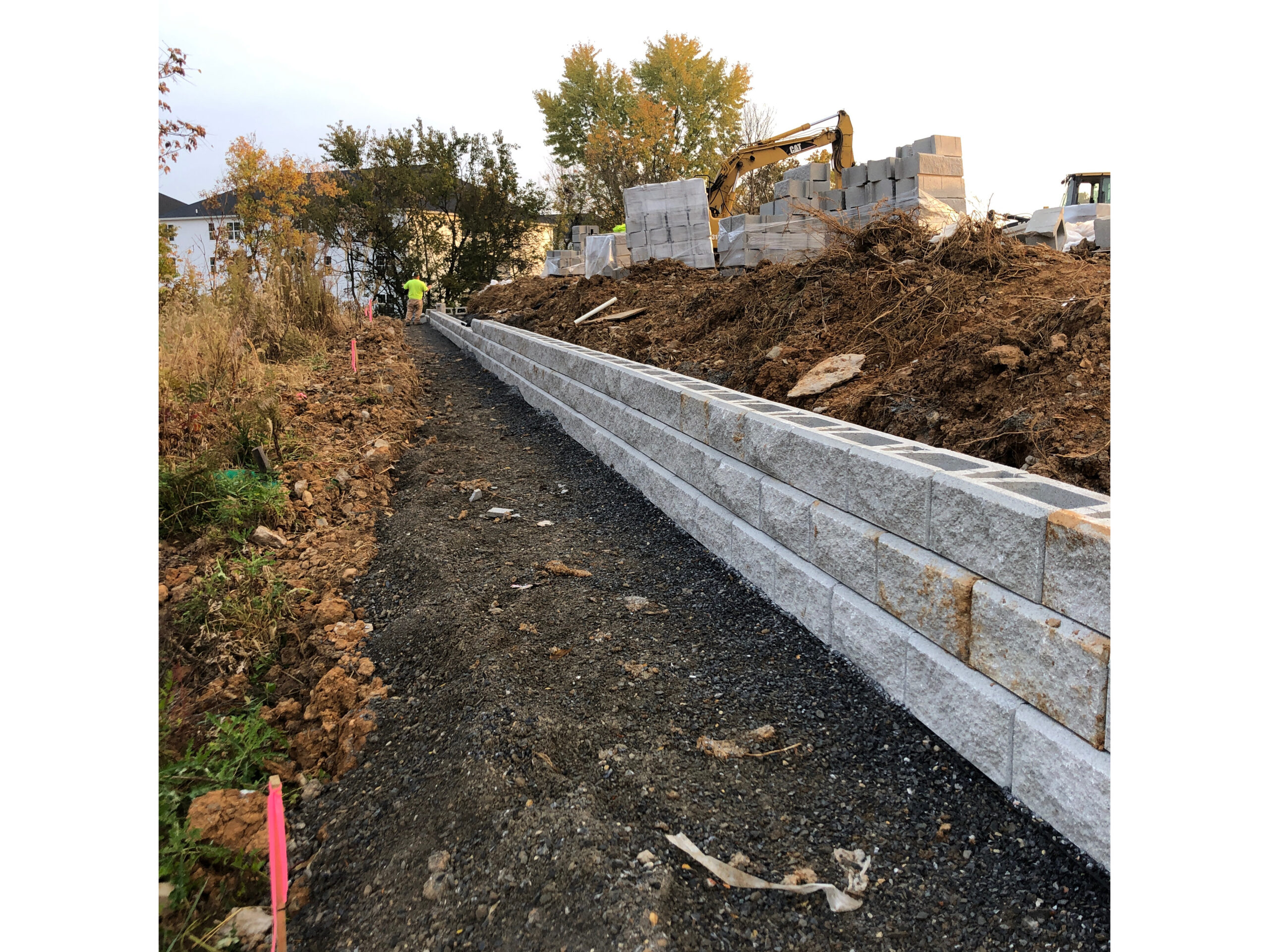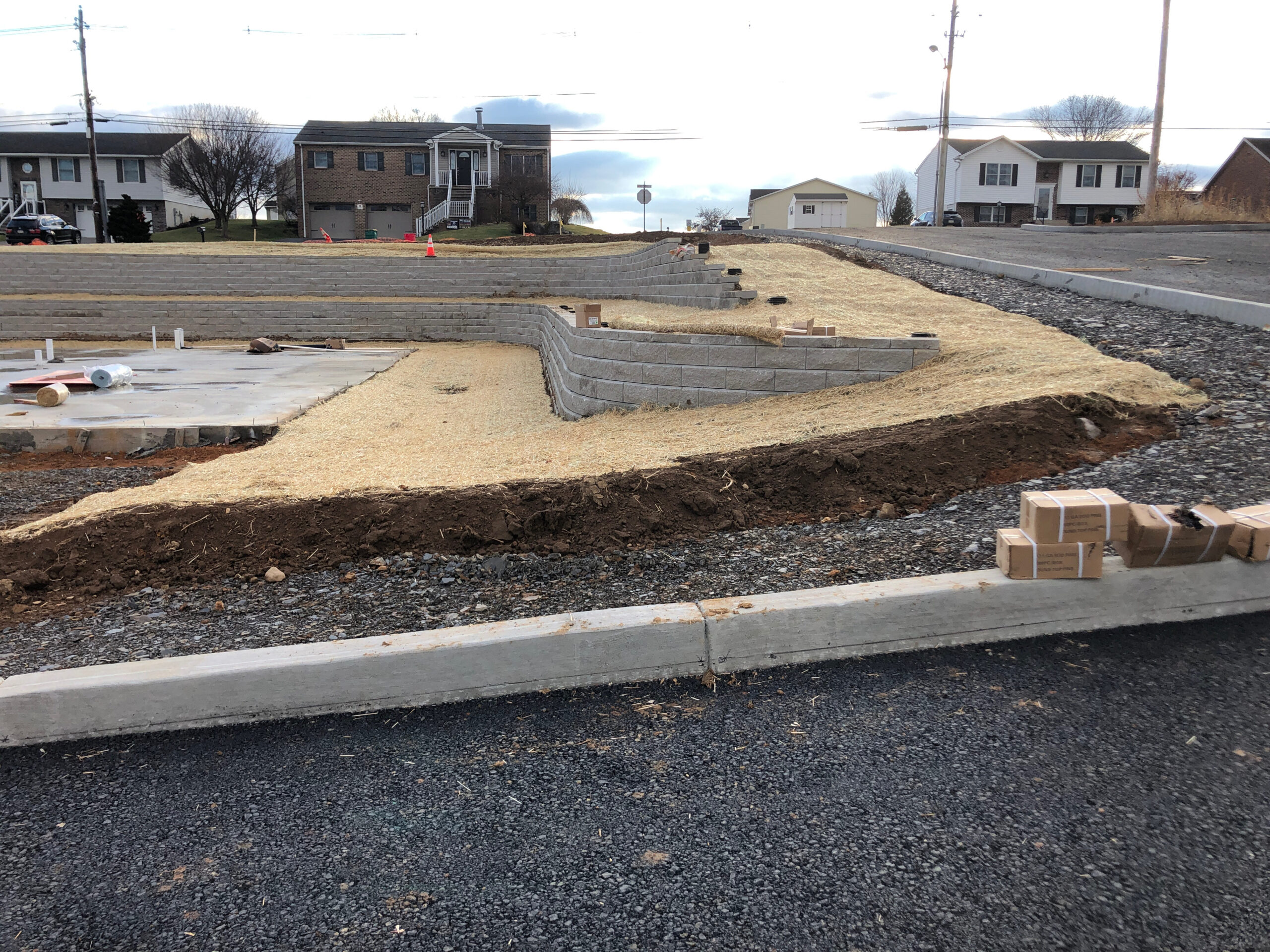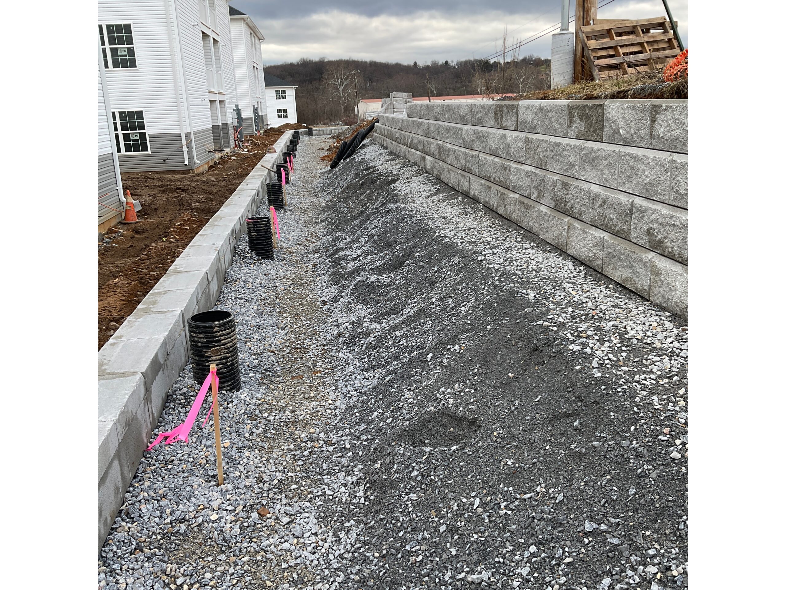 DHM crews handled everything from start to finish on these retaining walls at our Creekside project in Chambersburg. Starting with preparing the subgrade with compacted stone and then placing the retaining walls at several locations. Backfilling the walls as they were built and then ultimately preparing topsoil to be placed and graded. Seeding was completed and erosion control matting installed to decrease the chances of washouts. There was a total of 7250 square foot of retaining wall installed