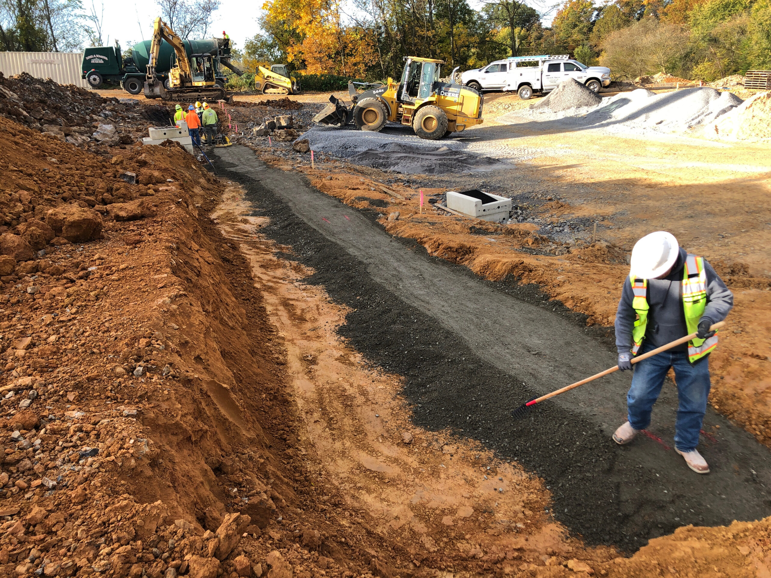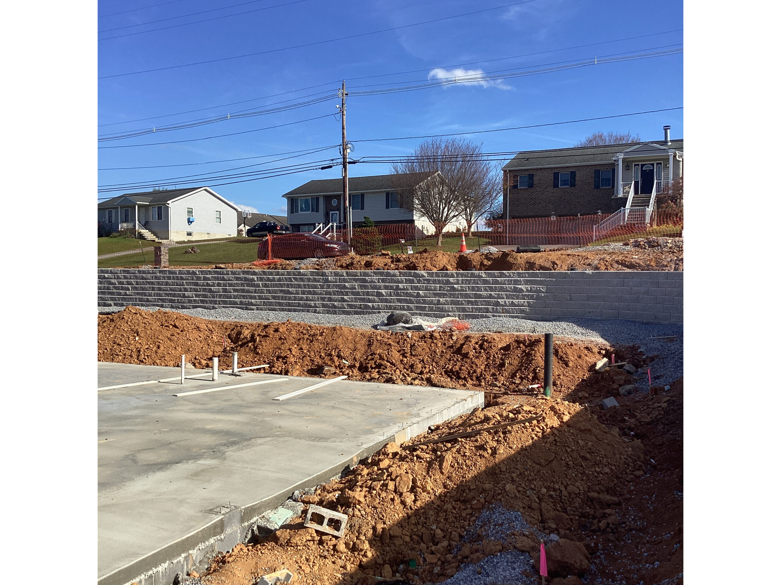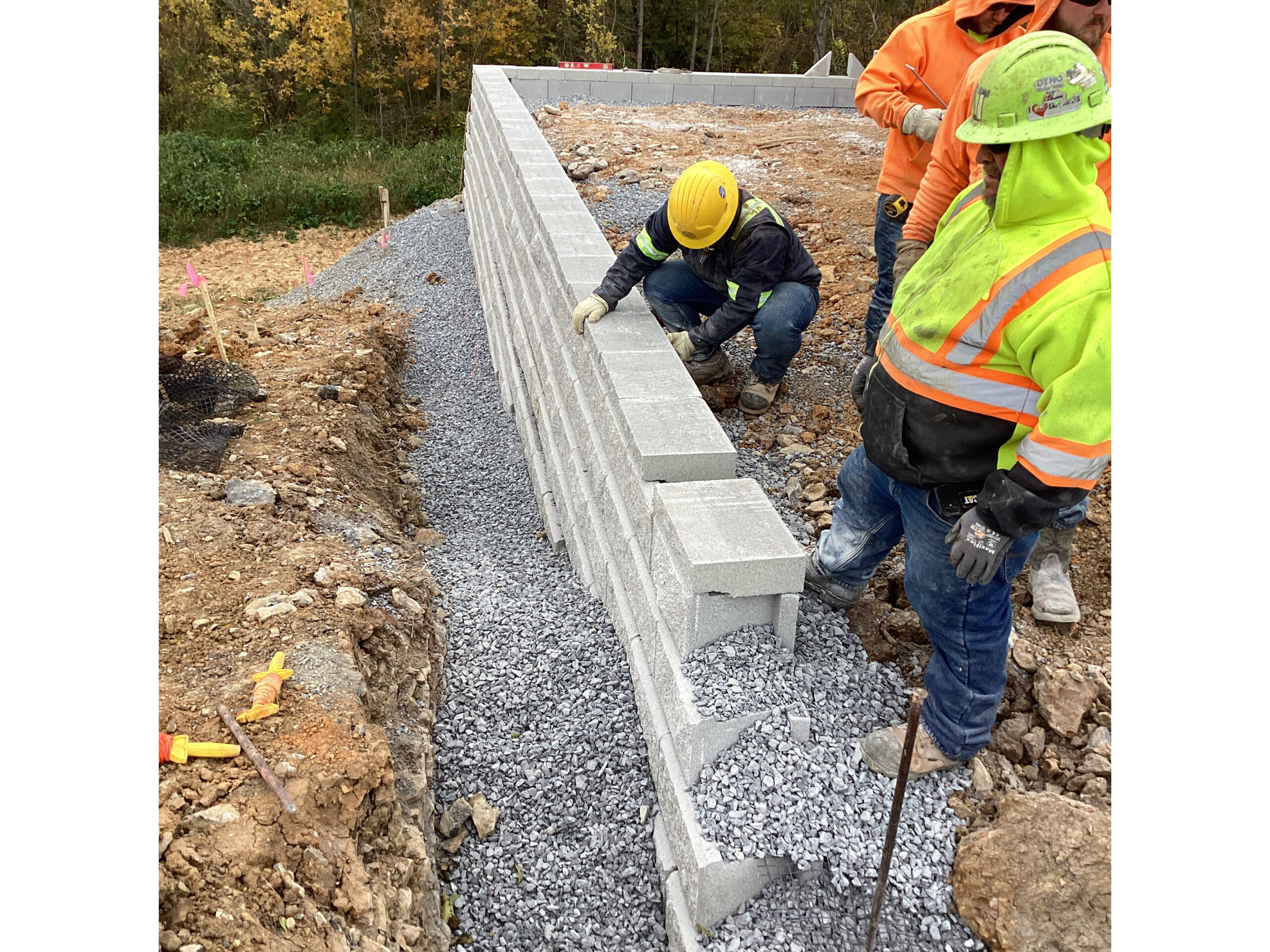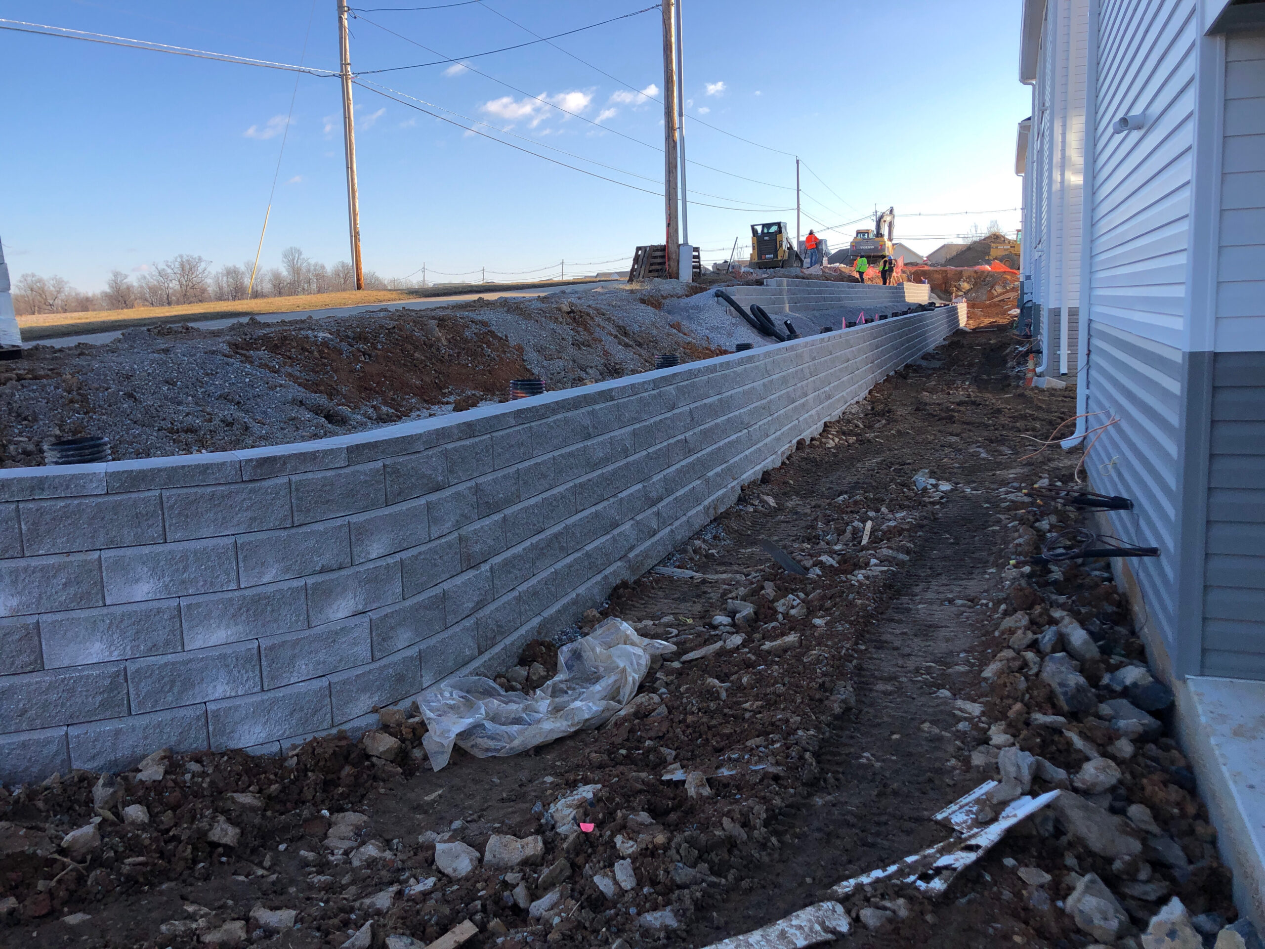 DHM crews handled everything from start to finish on these retaining walls at our Creekside project in Chambersburg. Starting with preparing the subgrade with compacted stone and then placing the retaining walls at several locations. Backfilling the walls as they were built and then ultimately preparing topsoil to be placed and graded. Seeding was completed and erosion control matting installed to decrease the chances of washouts. There was a total of 7250 square foot of retaining wall installed