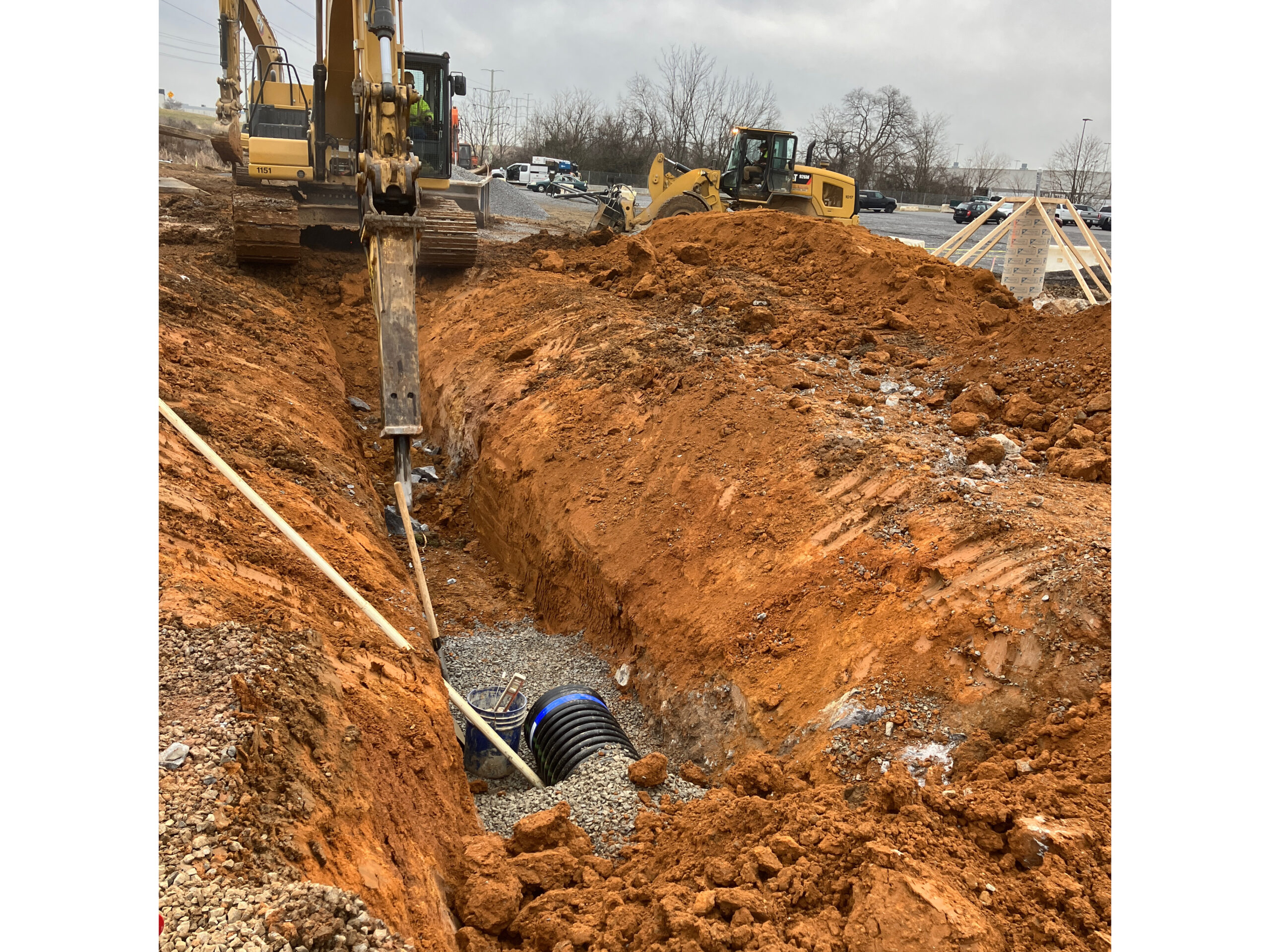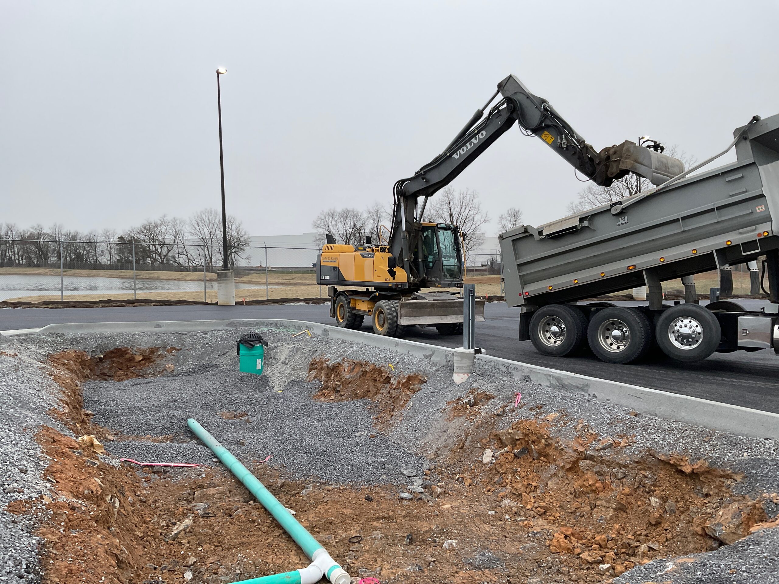 This project started out with us having to clear and grub a small area and modify an existing weir wall. Although the amount of actual earth that we had to move was minimal at just 30,000 cubic yard, the scope of the project included 43,000 square yards of paving, 59,700 square feet of concrete flat work for trailer storage and 4,500 feet of curbing. Our crews worked tirelessly to complete this work and meet our clients deadline. Of course, with the location being in Hagerstown we encountered rock but with some drilling, blasting and hydra hammer work, it was soon completed and we moved on to the next stage